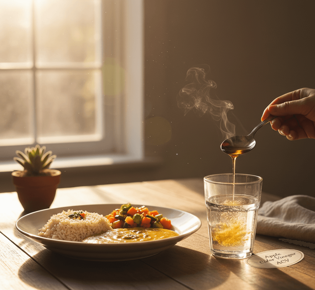 - हैक: किसी भी बड़े मील (Lunch/Dinner) से 10-15 मिनट पहले, एक गिलास पानी में 1 बड़ा चम्मच सिरका (Apple Cider Vinegar या साधारण सफ़ेद सिरका) मिलाकर पिएं। (स्ट्रॉ से पिएं ताकि दाँत खराब न हों)।