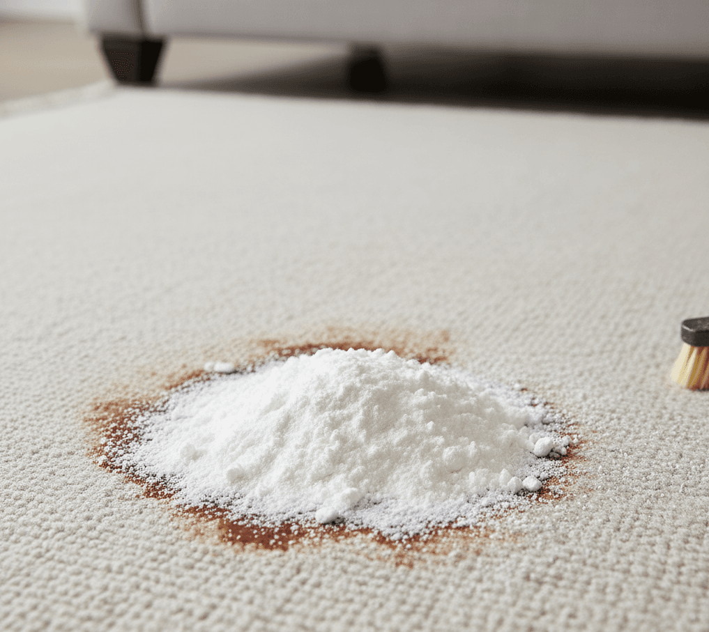 - अब, उस दाग़ पर “बेकिंग सोडा” (Baking Soda) छिड़कें (ताकि वो सारी नमी और बदबू सोख ले)।