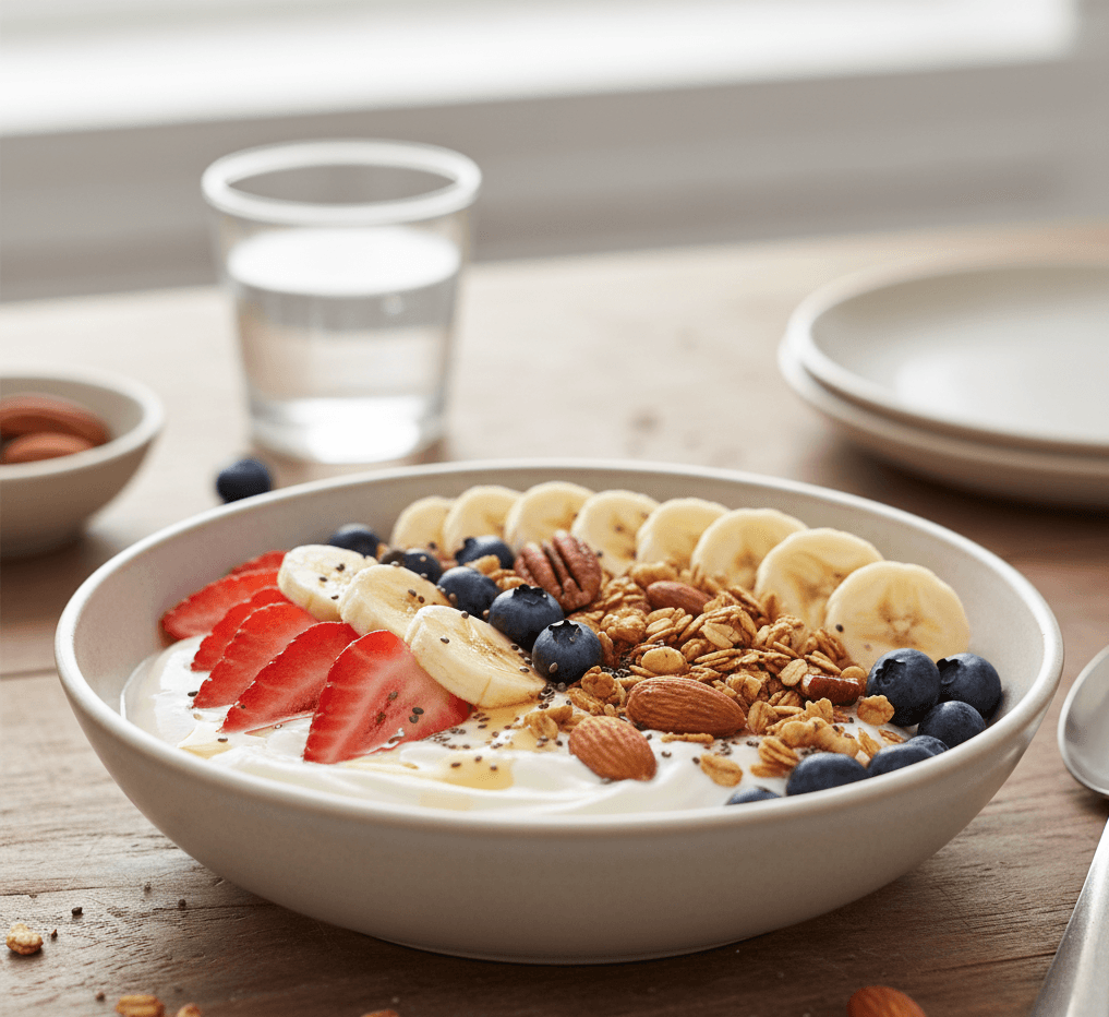 Protein और fiber-rich breakfast जैसे oats, sprouts या दही वाले फल।